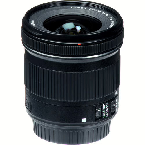 Canon EF-S 10-18mm f/4.5-5.6 IS STM Lens is a flexible wide-angle zoom in a compact form factor, the EF-S 10-18mm f/4.5-5.6 IS STM from Canon is a 16-28.8mm equivalent lens designed for EF-S-mount DSLRs. Helping to reduce the overall size while maintaining high optical quality, a four-group zoom design is employed along with one ultra-low dispersion element, one aspherical element, and one large-diameter element to produce sharp, clear imagery void of chromatic and spherical aberrations.