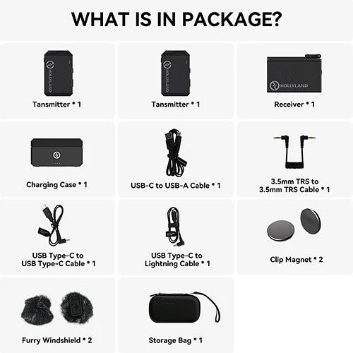 Connectivity is highly versatile, offering wide device compatibility. The dual-channel receiver outputs audio through a 3.5mm jack for DSLR and mirrorless cameras via the included TRS cable. Its USB-C port, paired with the included USB-C–to-USB-C and MFi-certified USB-C–to-Lightning cables, allows direct connection to Android and iOS devices. You can even monitor playback in real time using your phone's speaker while the receiver is connected. Support for UAC standards enables the receiver to function as a USB sound card when plugged into a computer.