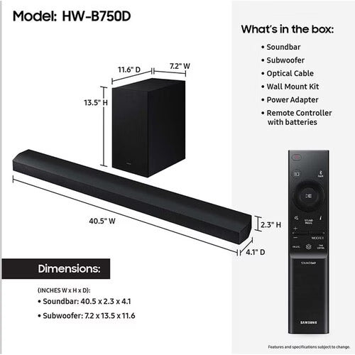 Samsung HW-B750D 400W 5.1-Ch Soundbar System delivers immersive, multi-directional sound to movies and TV shows, providing a more immersive experience. You also get a wireless subwoofer for intense, booming bass that completes the surround experience. Even within that complex soundscape, voices and dialogue can be easily heard, thanks to dedicated center and side drivers, and Samsung’s Adaptive Sound and Voice Enhanced technologies. Outside of movies and TV, gamers in the family will enjoy synced directional audio in Game Mode, and music lovers can seamlessly stream from mobile devices via Bluetooth.